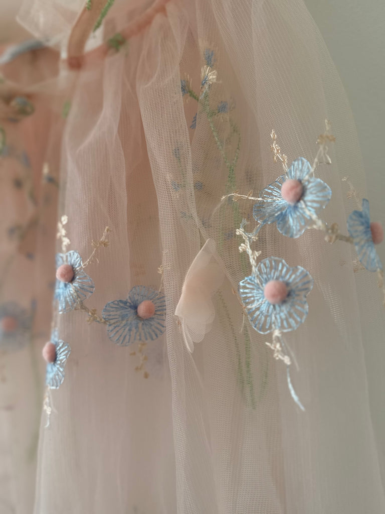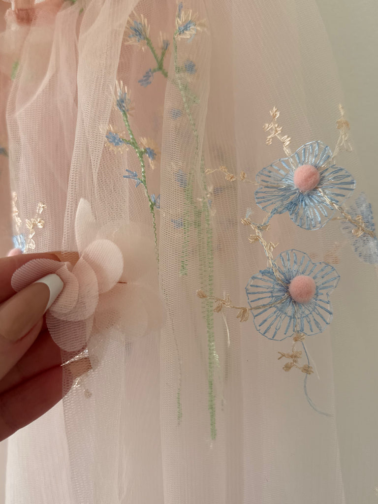 The embroidery resembles a blooming meadow, giving the cape a magical, fairy-like charm.